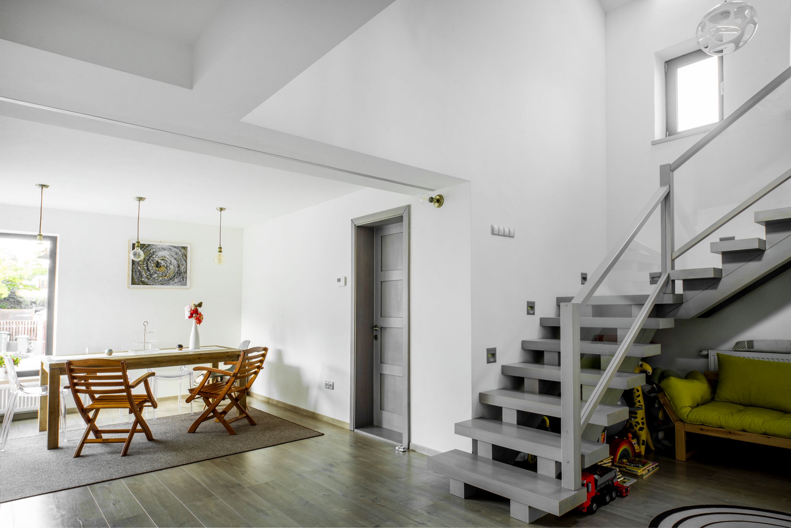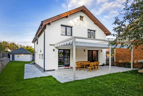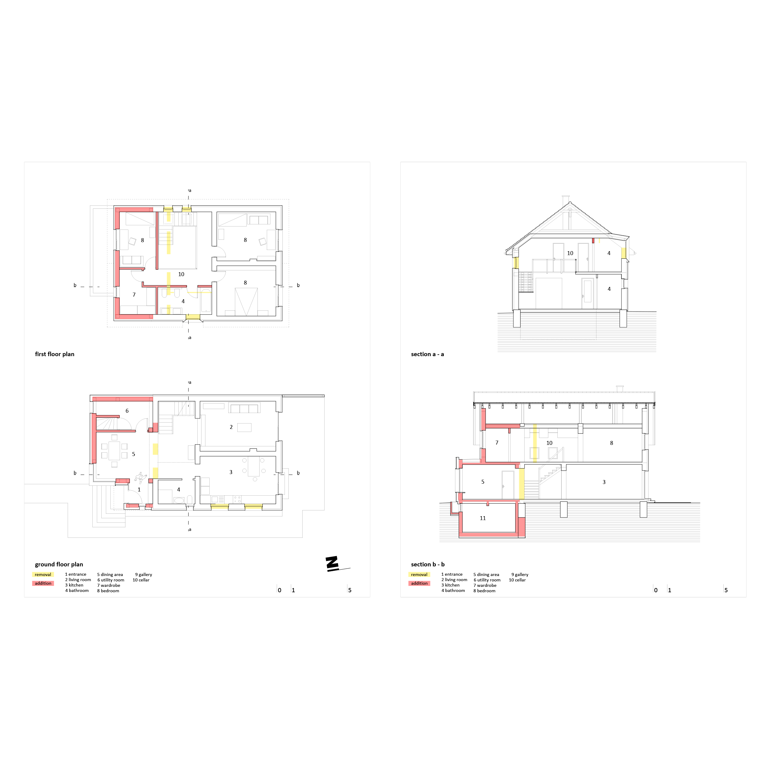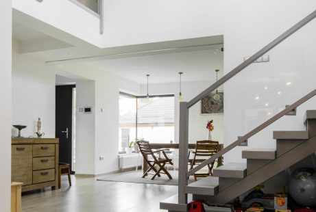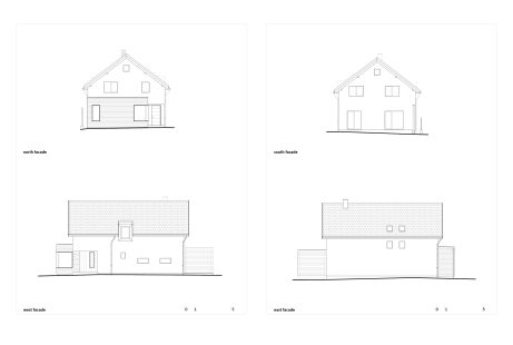The proposed interventions further extend the building approximately 4.5m to the north, including the construction of a cellar in the basement beneath the new volume. Functionally, the extension allows for a more efficient layout of the stairs to the upper floor, a generous dining area/hallway, and a technical room. The upper floor gains an additional bedroom and a walk-in closet. The building was fitted with a thermal envelope, and the ground-floor openings on the southern facade were enlarged to provide access to a new semi-covered terrace.
