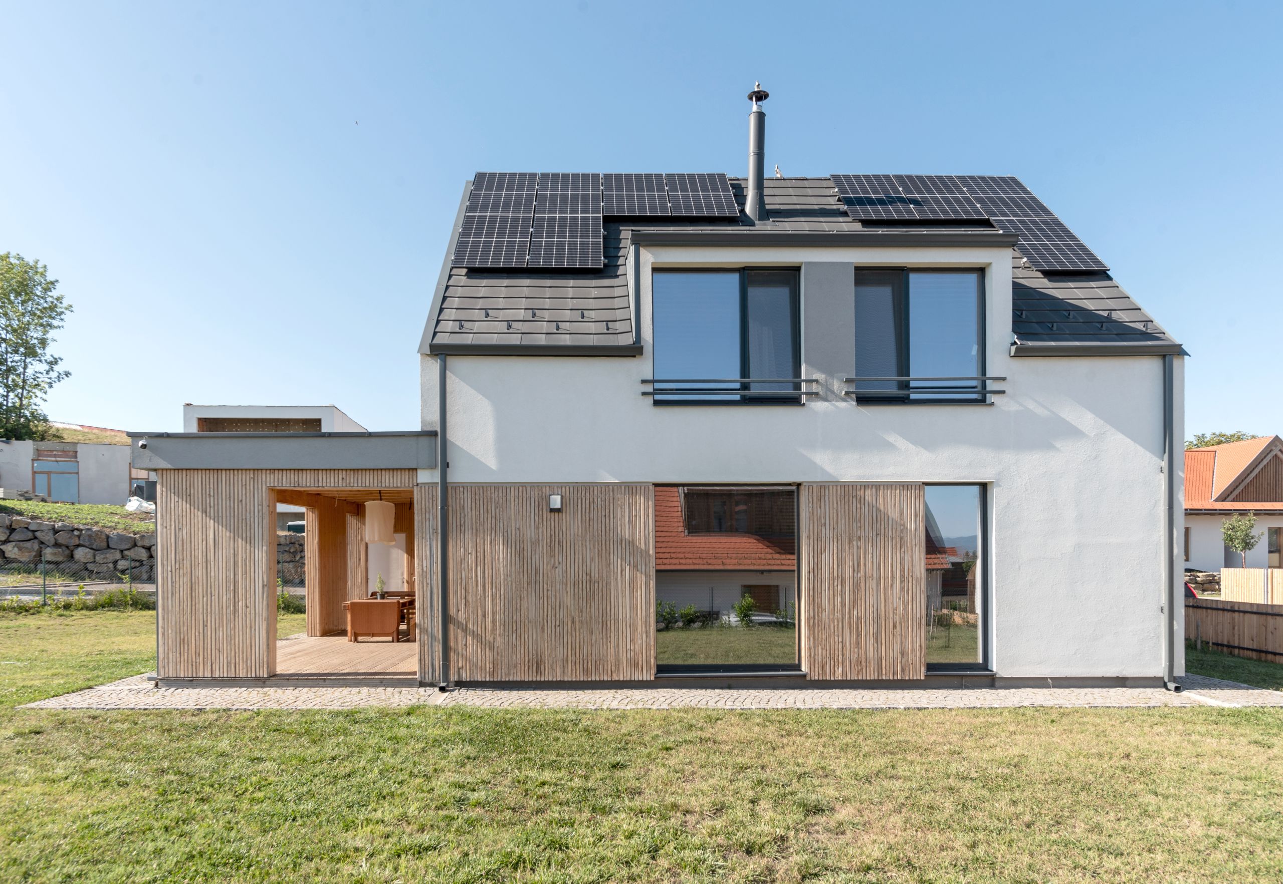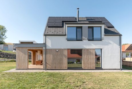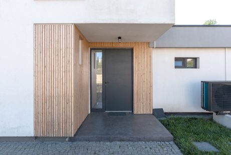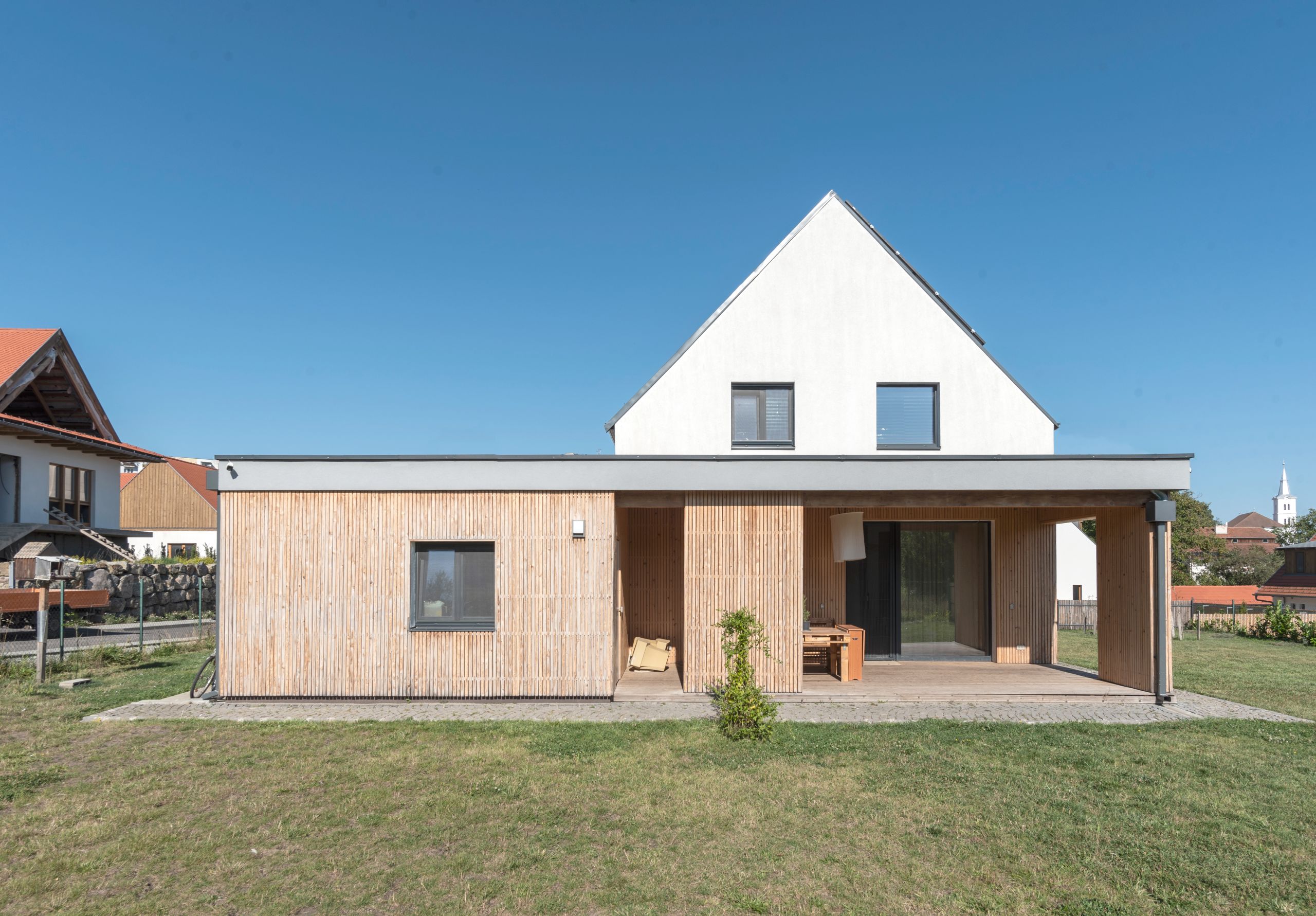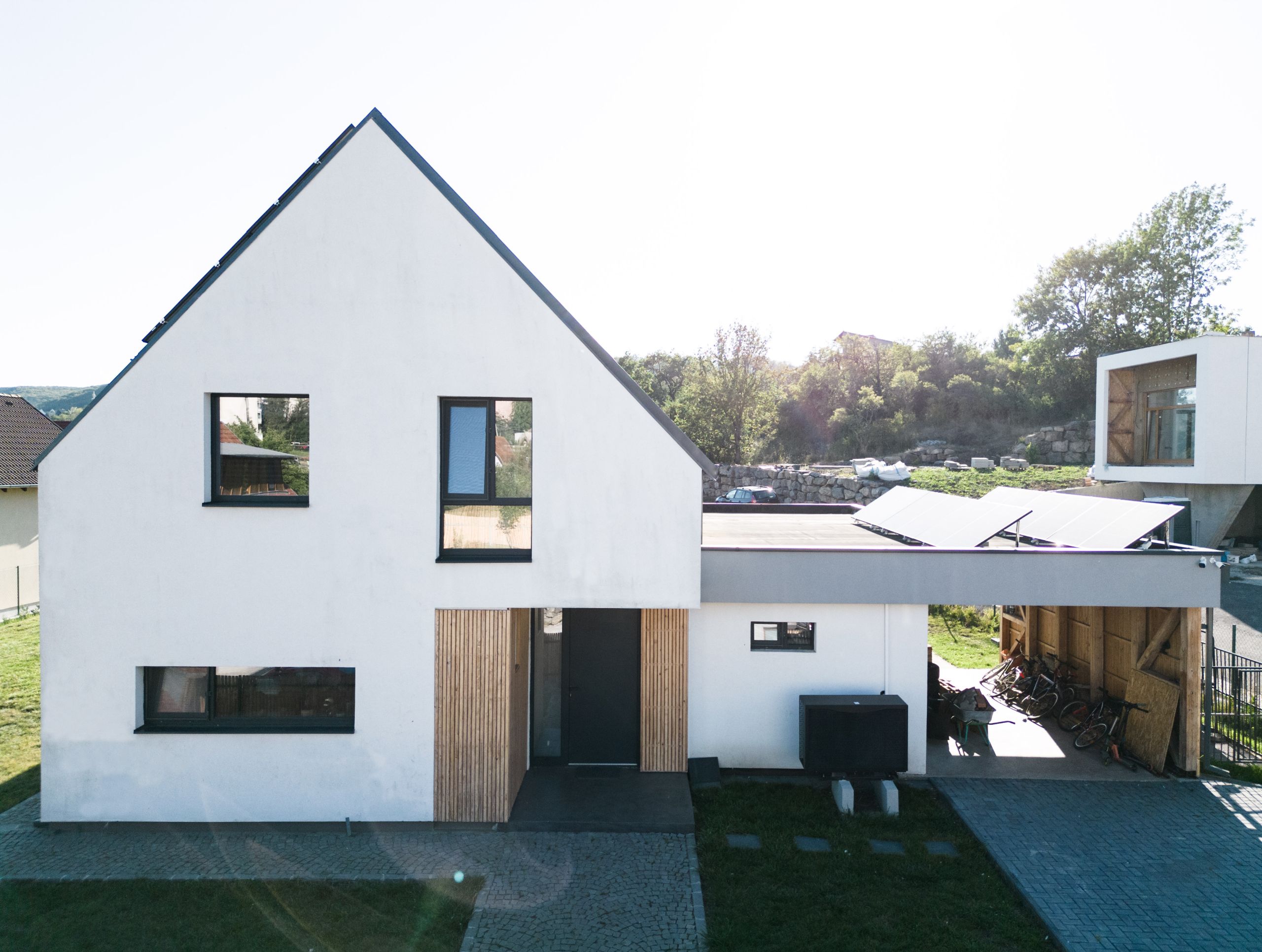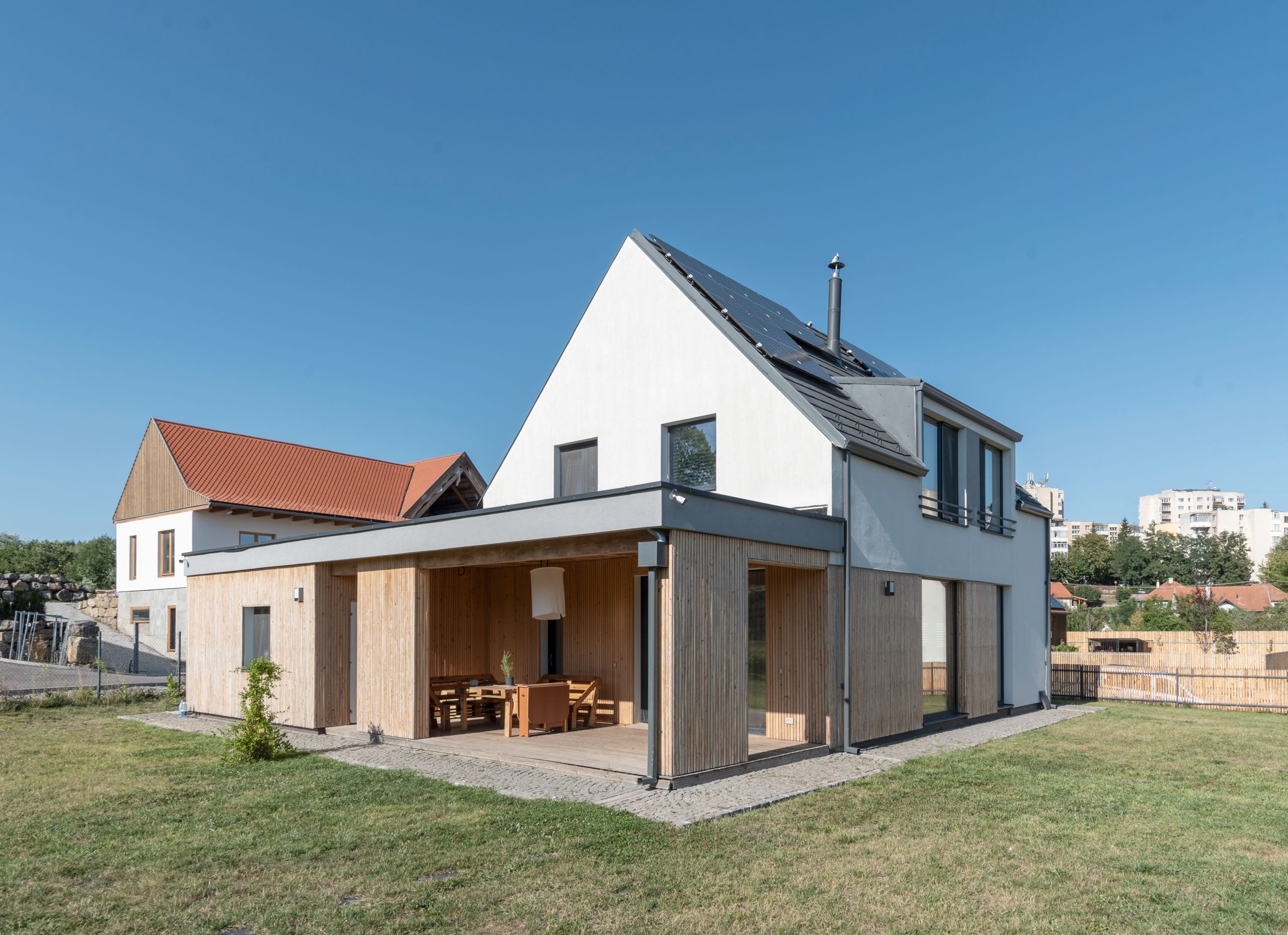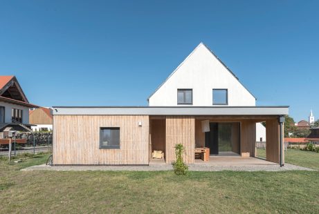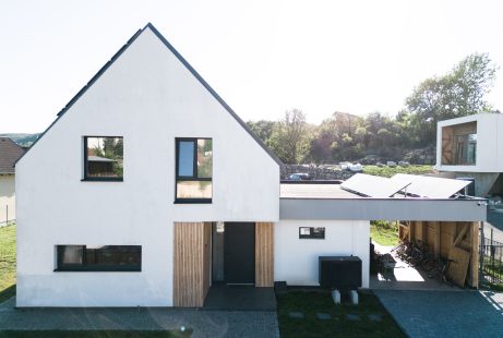 The main volume evokes the archetype of the gabled house, reinterpreted in a contemporary key, while a single-story timber annex accommodates technical spaces, carport, storage, and a music studio – a distinctive feature of the project. The street façade is sober, with controlled openings ensuring privacy, contrasted by the generous garden-facing side, where living areas and the music room open fluidly towards the terrace. The plan is clear: daytime spaces oriented to the exterior, compact night zone, and efficient circulation. Materials underline simplicity: white plaster for the main body and vertical timber cladding for the annex, emphasizing the dialogue between permanence and lightness. Technically, the house is energy-efficient, with optimized orientation, high-performance insulation, strategically sized windows, and underfloor heating powered by a heat pump.