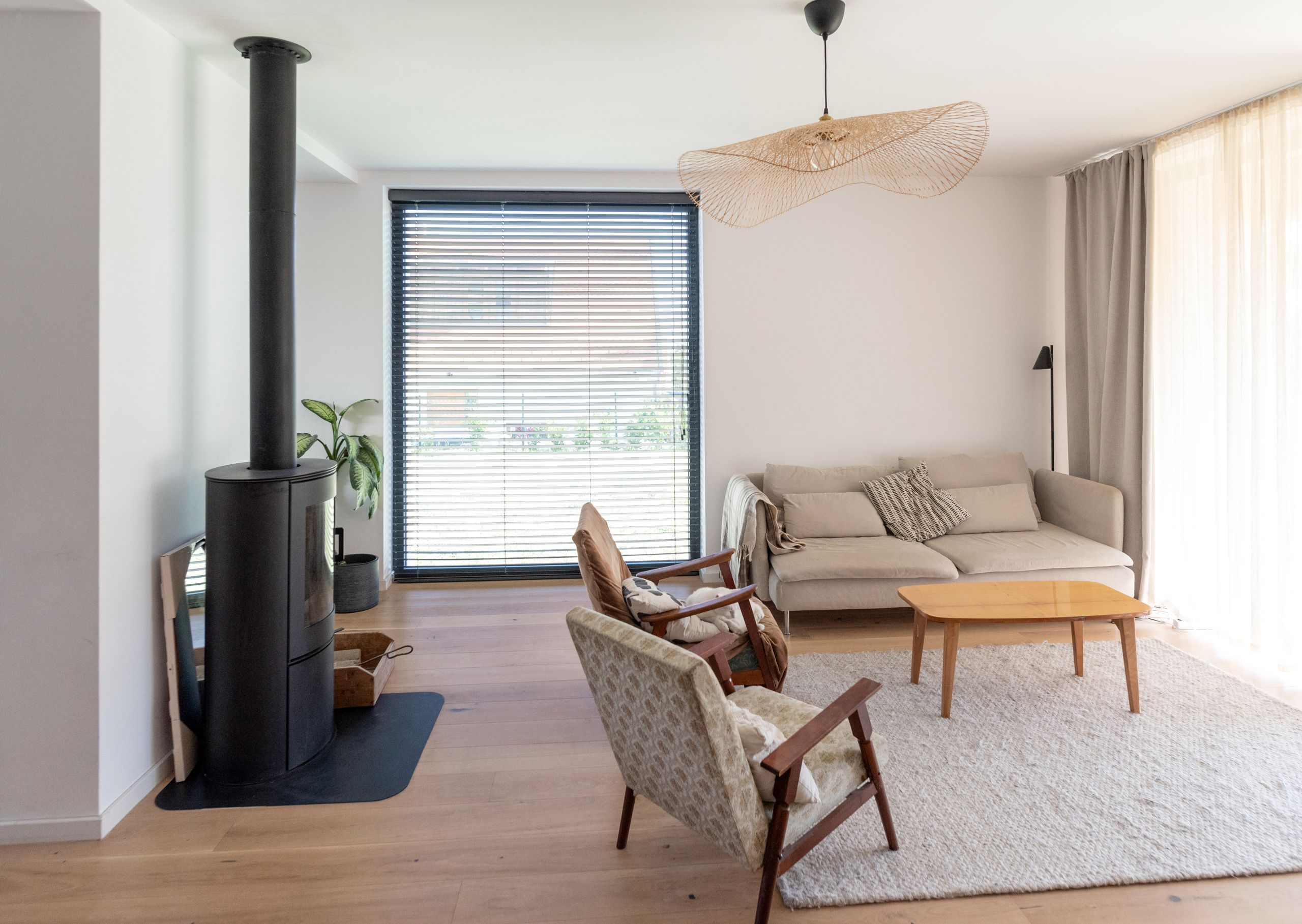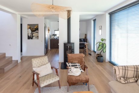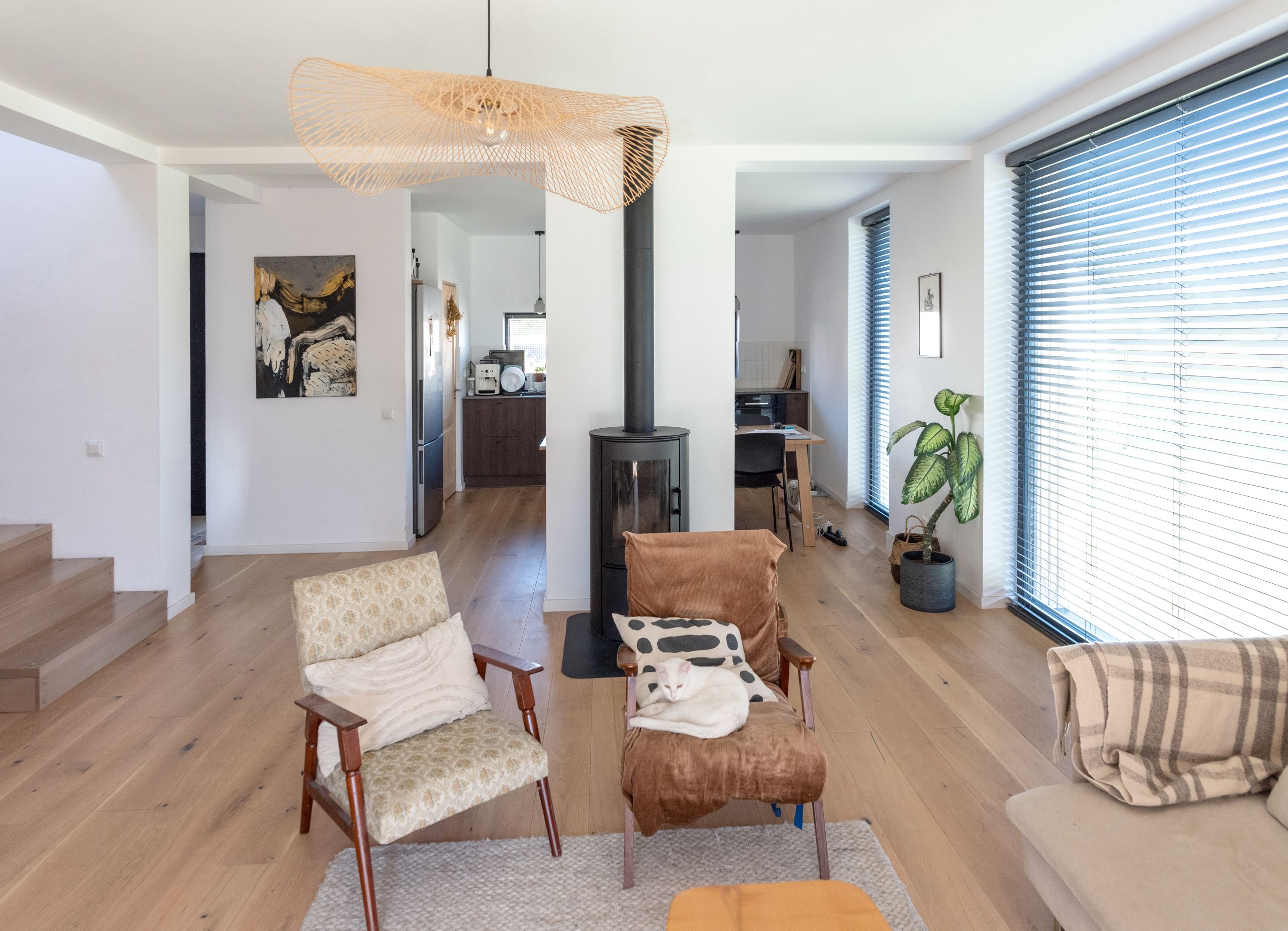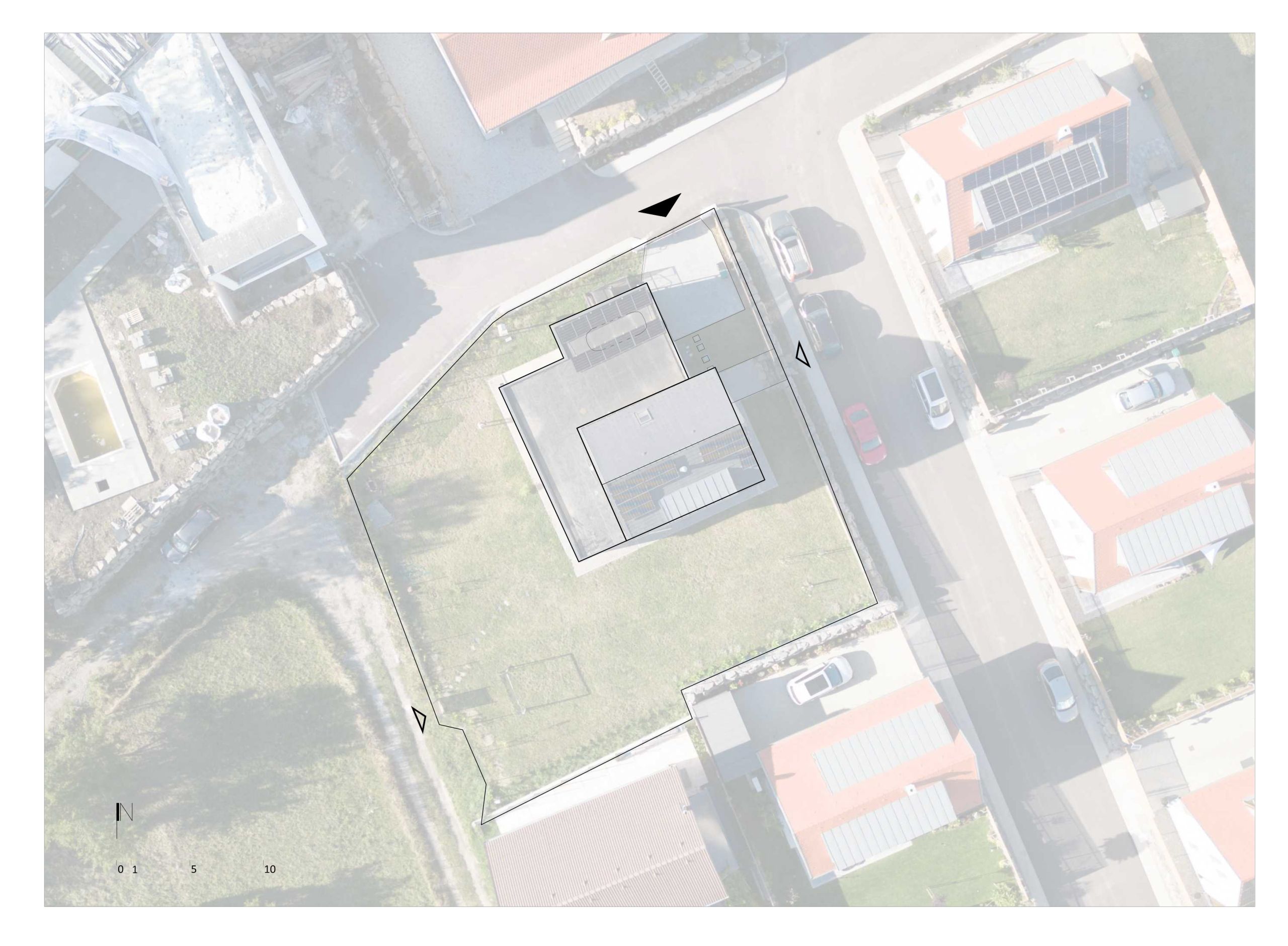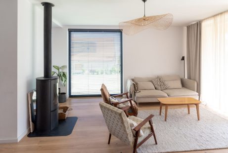 The main volume evokes the archetype of the gabled house, reinterpreted in a contemporary key, while a single-story timber annex accommodates technical spaces, carport, storage, and a music studio – a distinctive feature of the project. The street façade is sober, with controlled openings ensuring privacy, contrasted by the generous garden-facing side, where living areas and the music room open fluidly towards the terrace. The plan is clear: daytime spaces oriented to the exterior, compact night zone, and efficient circulation. Materials underline simplicity: white plaster for the main body and vertical timber cladding for the annex, emphasizing the dialogue between permanence and lightness. Technically, the house is energy-efficient, with optimized orientation, high-performance insulation, strategically sized windows, and underfloor heating powered by a heat pump.