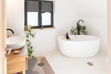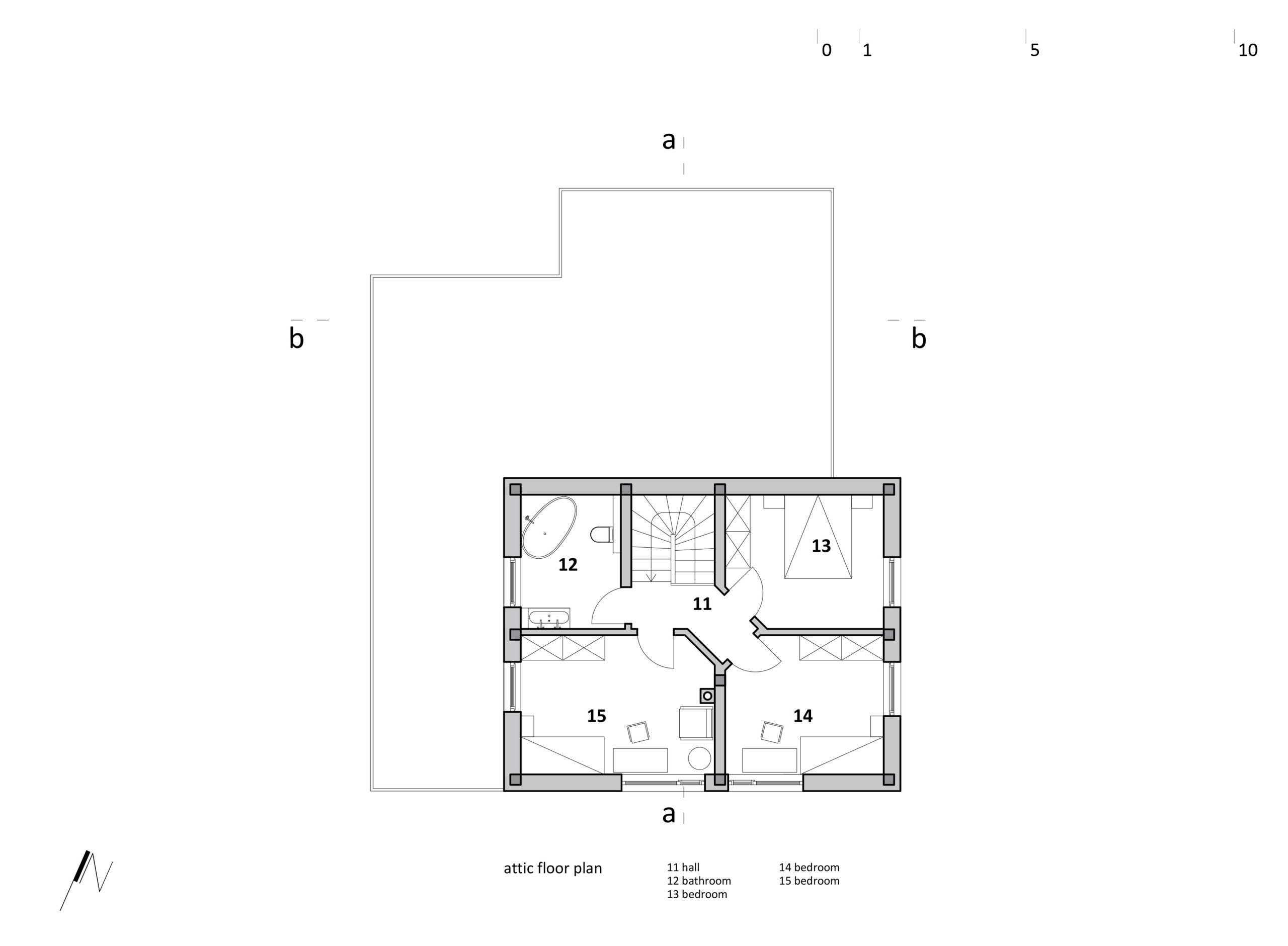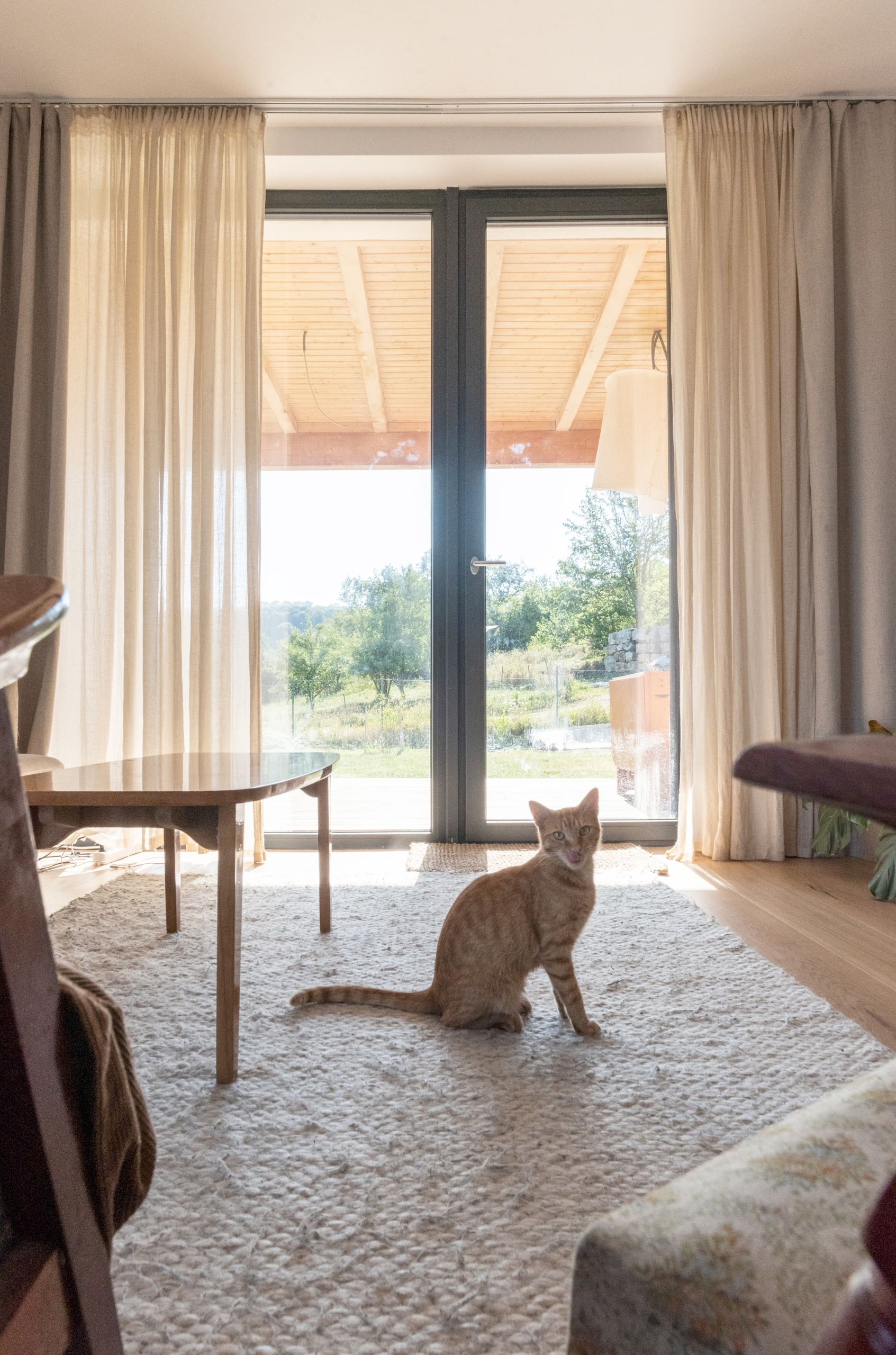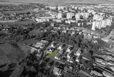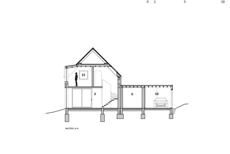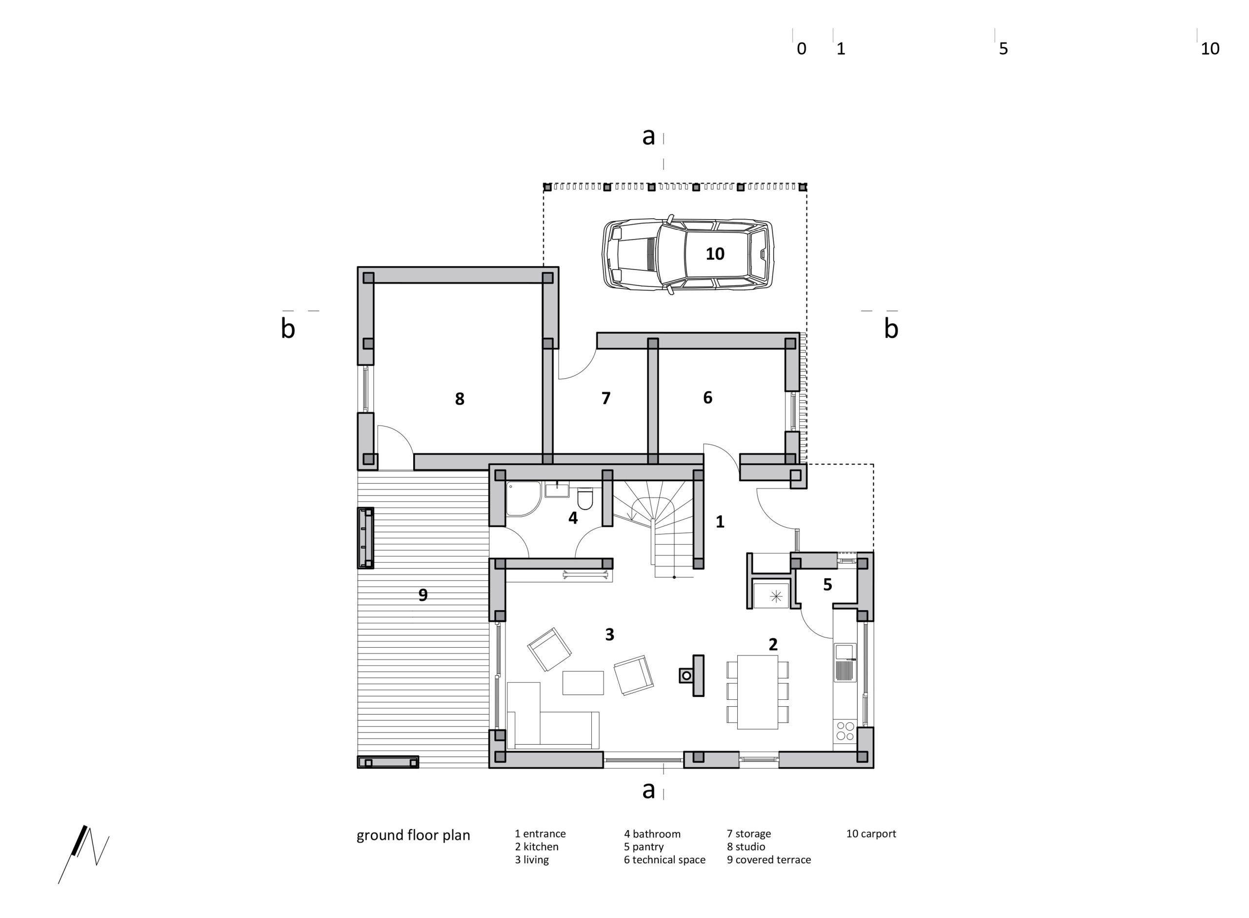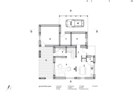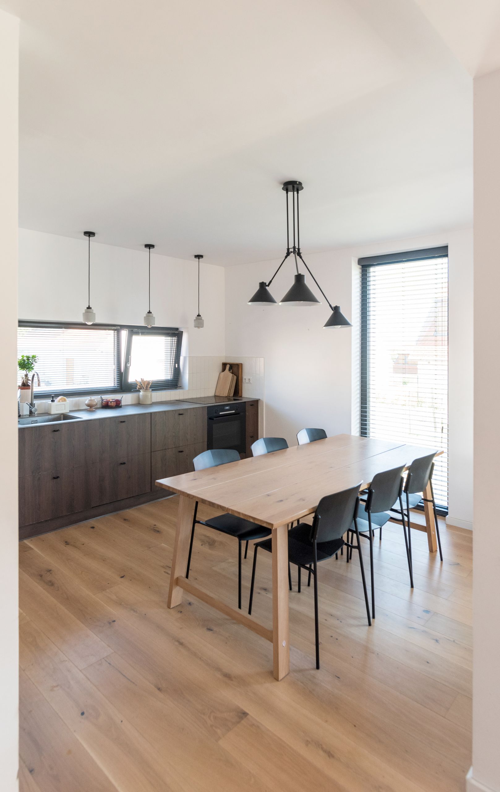 The main volume evokes the archetype of the gabled house, reinterpreted in a contemporary key, while a single-story timber annex accommodates technical spaces, carport, storage, and a music studio – a distinctive feature of the project. The street façade is sober, with controlled openings ensuring privacy, contrasted by the generous garden-facing side, where living areas and the music room open fluidly towards the terrace. The plan is clear: daytime spaces oriented to the exterior, compact night zone, and efficient circulation. Materials underline simplicity: white plaster for the main body and vertical timber cladding for the annex, emphasizing the dialogue between permanence and lightness. Technically, the house is energy-efficient, with optimized orientation, high-performance insulation, strategically sized windows, and underfloor heating powered by a heat pump.